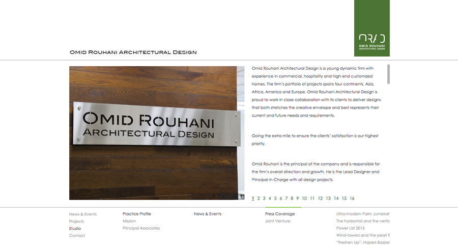 Omid Rouhani Architectural Design is a young dynamic firm with experience in commercial, hospitality and high-end customized homes. The firm’s portfolio of projects spans four continents, Asia, Africa, America and Europe. Omid Rouhani Architectural Design is proud to work in close collaboration with its clients to deliver designs that both stretches the creative envelope and best represents their current and future needs and requirements.